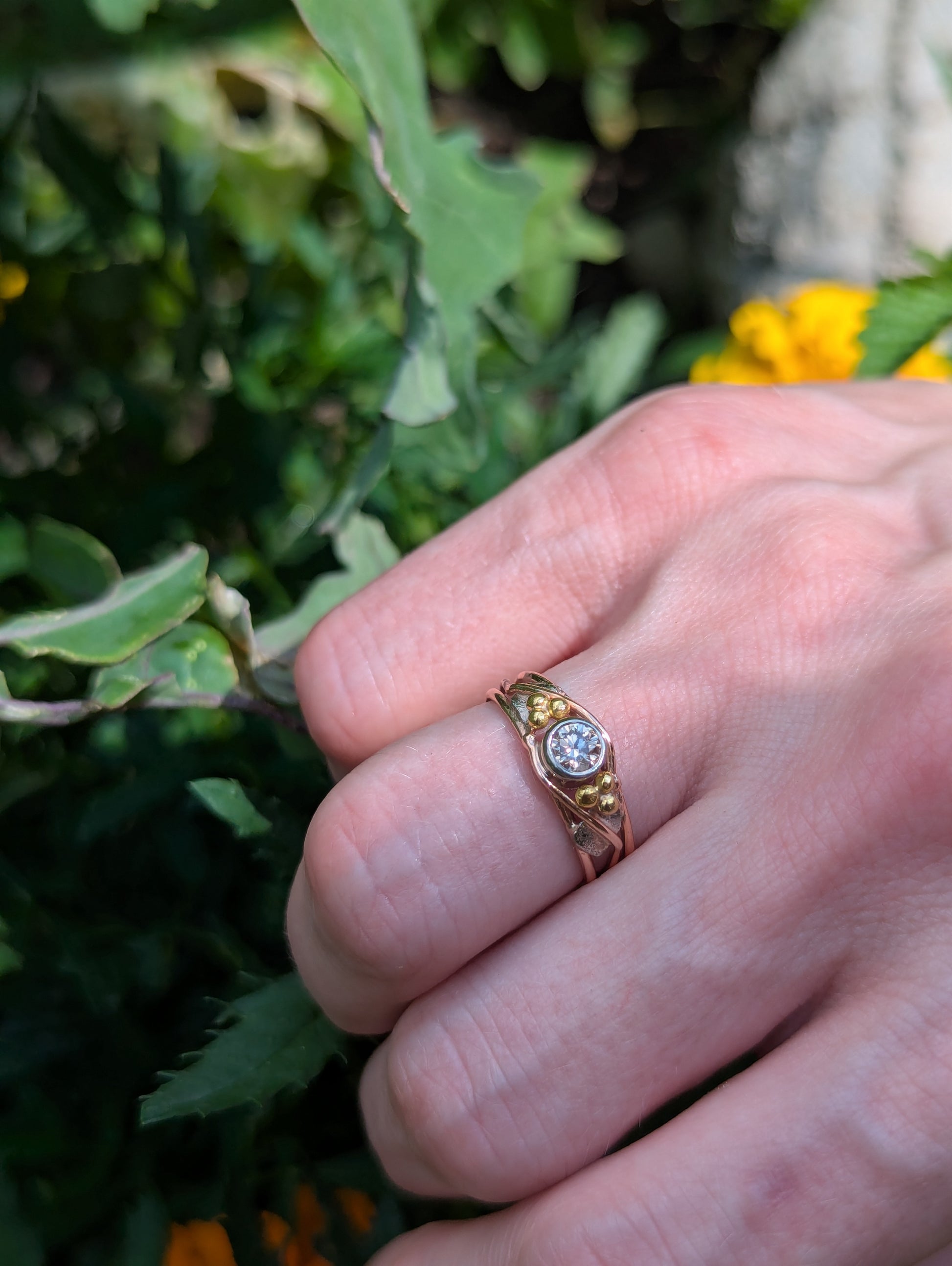 Sparkling warm tone diamond, bezel set in delicate ring, hand fabricated in 18K yellow and white gold and 14K rose gold.
