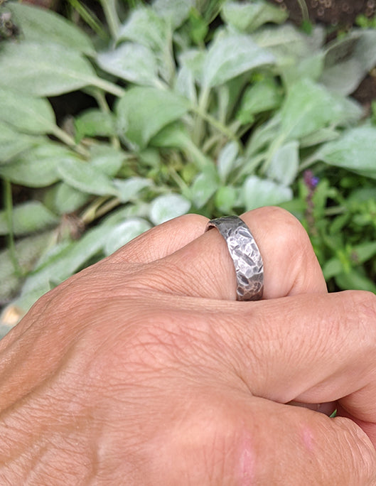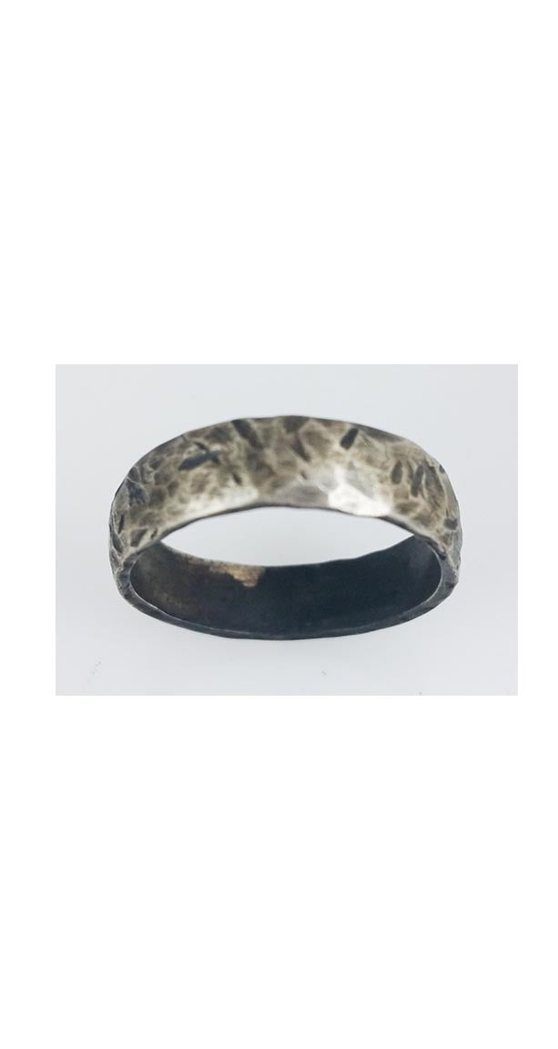 5-6mm sterling silver band, flat with a distressed, beaten texture, oxidation