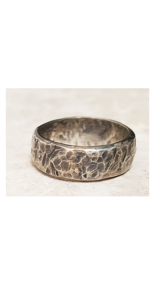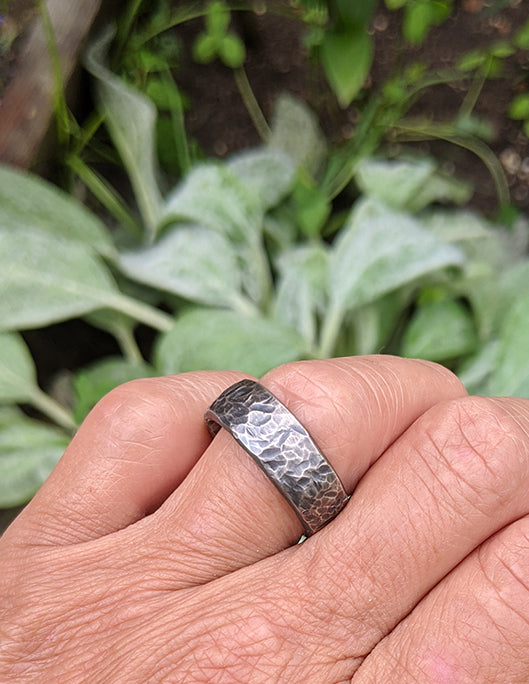 6-7mm heavy sterling silver band with a beaten texture, oxidation and slightly domed.