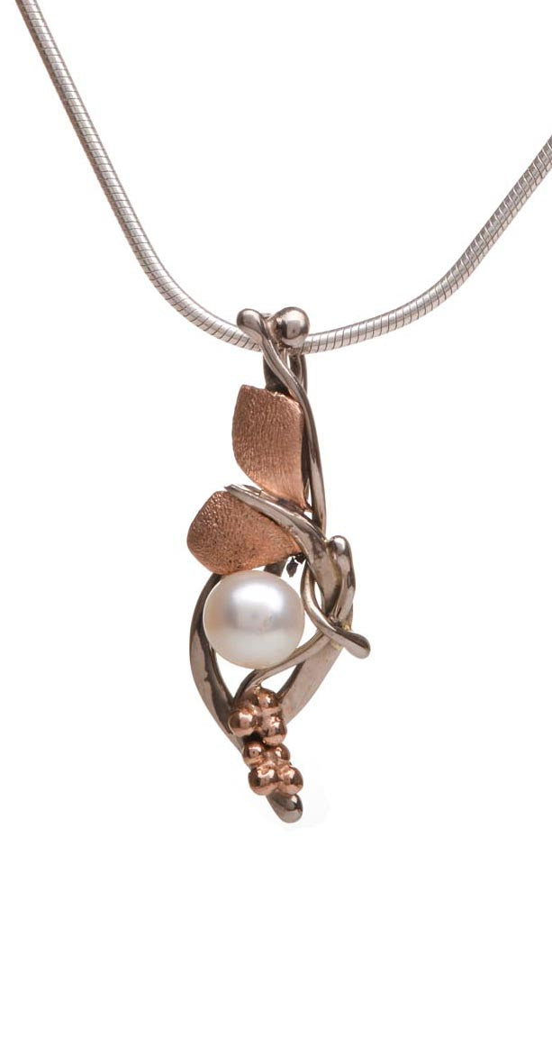 Fresh water pearl pendant, hand fabricated in white gold, with rose gold leaves.